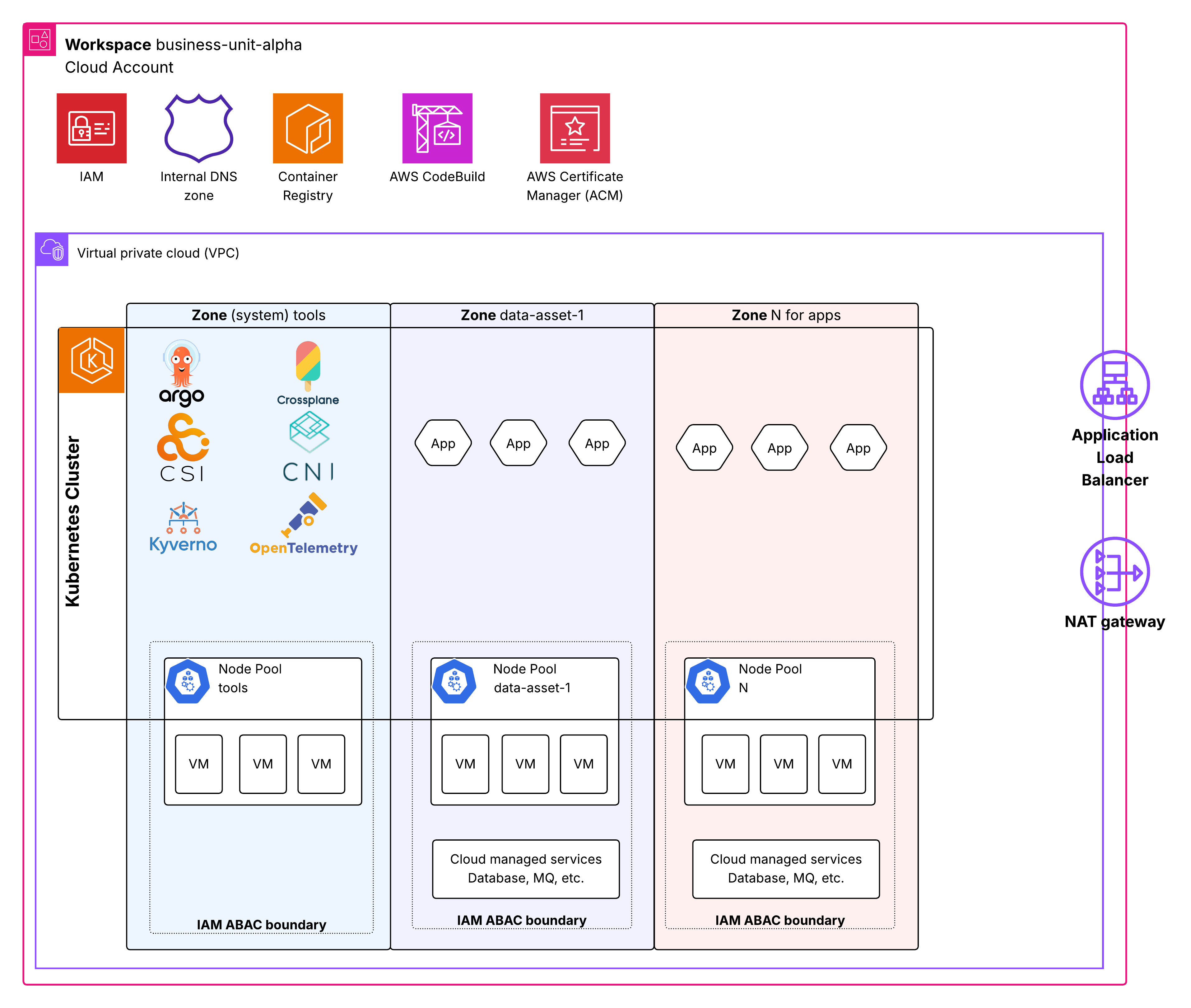 Platform tooling: Each workspace includes a dedicated deployment of tools that enable Kubernetes-based APIs to integrate with AWS APIs. These tools are deployed to a dedicated Zone and node pool.